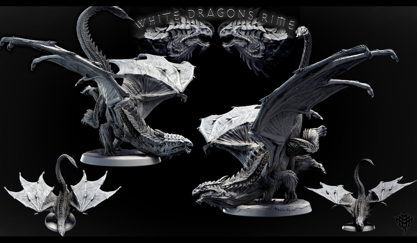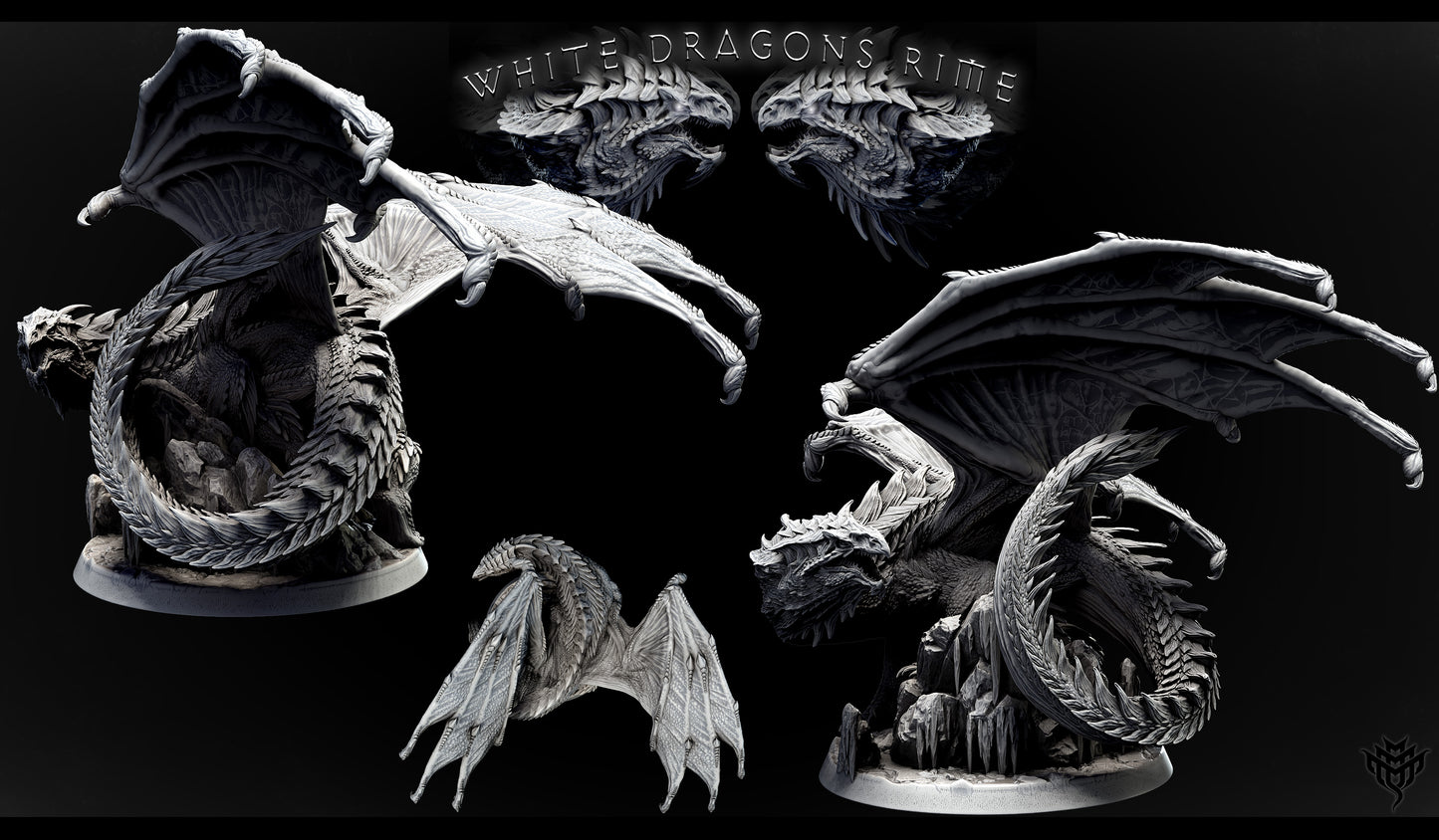 Adolescent White Dragon miniatures available in two striking poses on 50mm bases. Pose 1 coils around a rocky perch at 72mm tall, while Pose 2 towers at 107mm with a long arched neck and spread wings. Ideal for Dungeons & Dragons, Pathfinder, or Frostgrave TTRPG campaigns set in arctic realms.
