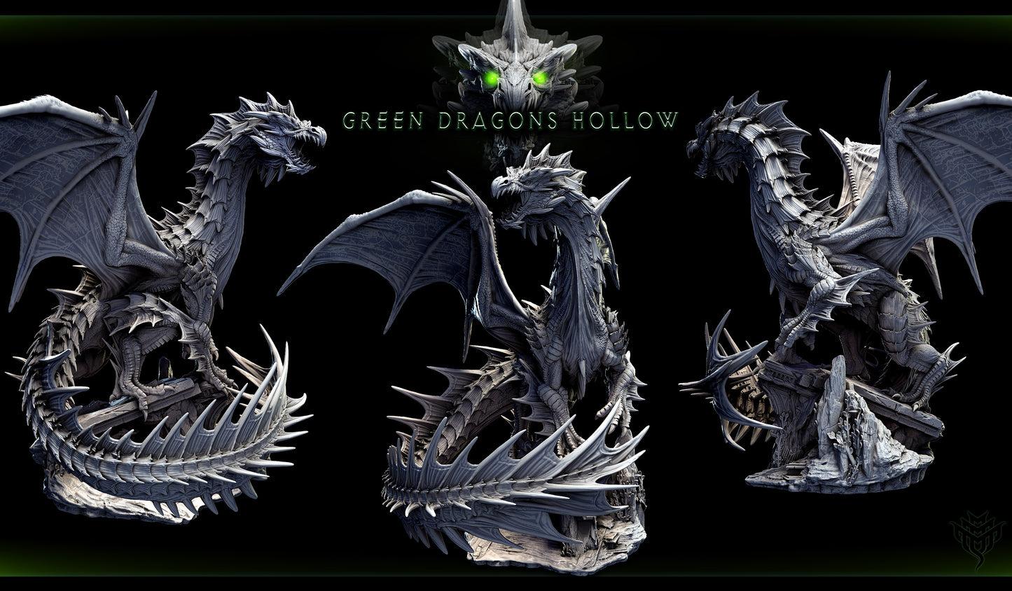 Adult Green Dragon miniatures presented in two epic poses—one coiled and roaring from a rocky base, the other in an ascending twist with extended wings and curled tail. Each sits on a 75mm base, ideal for campaigns in D&D 5e, Pathfinder, or Dragonbane. Perfect centerpiece models.