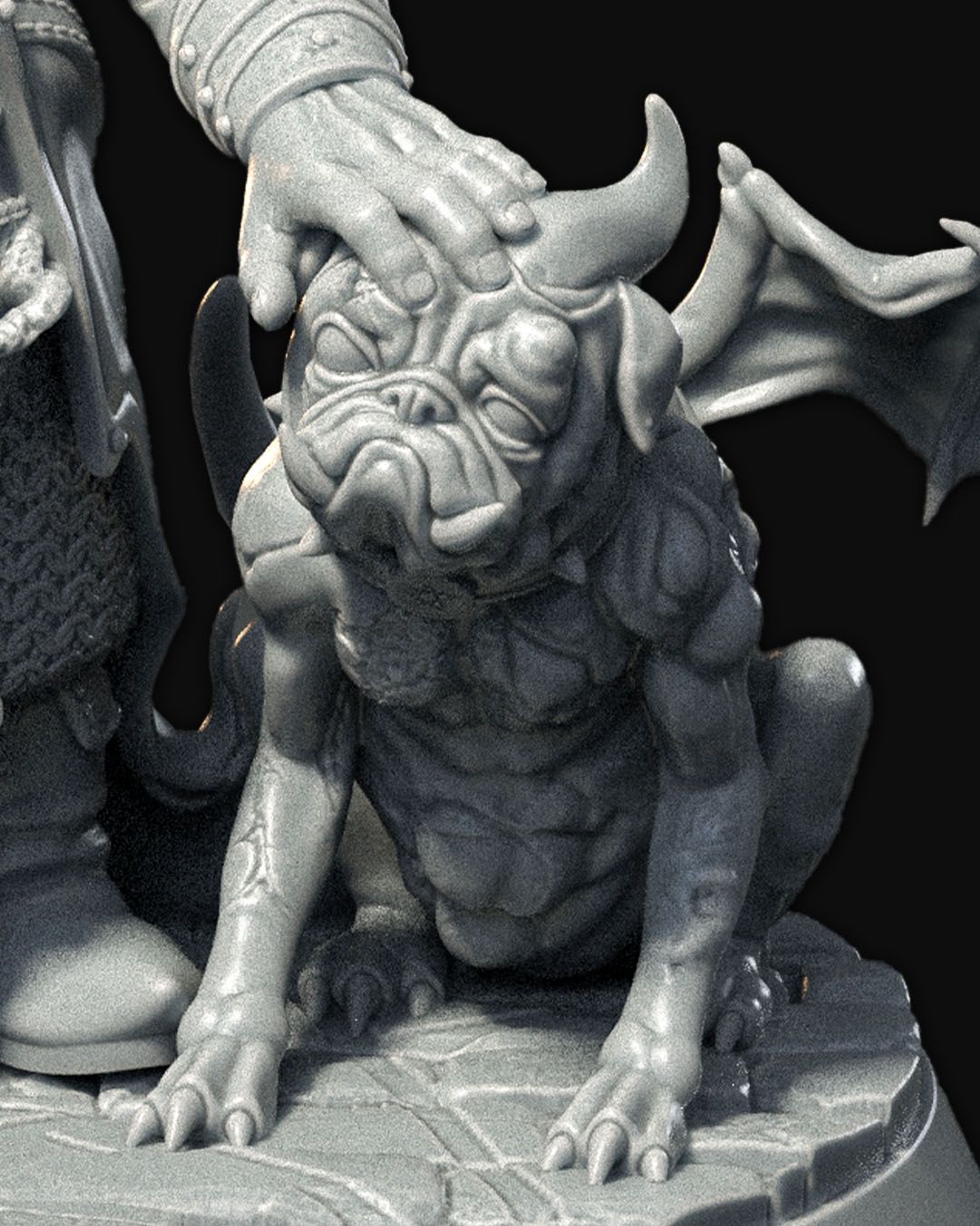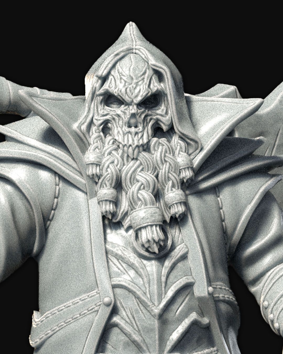 Baern Blackbone, a dwarf warlock miniature, stands menacingly with a sinister skeletal face and braided beard, accompanied by a demonic pet. His detailed robes and skull-headed scythe make him an imposing figure for tabletop RPGs like Dungeons & Dragons and Pathfinder.