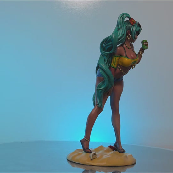 A detailed collectible figurine inspired by Hatsune Miku, reimagined in a beach-themed Brazilian style. Featuring long twin-tails, stylish sunglasses, and a playful pose, this figure captures a fun and relaxed summer vibe, perfect for display and collection.