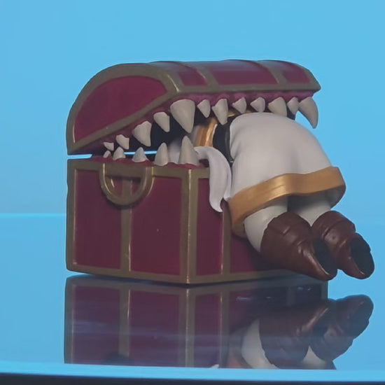 Chibi Frieren from Frieren: Beyond Journey’s End depicted in an adorable stylized figure. Includes swappable poses—standing with staff and lantern, or hilariously devoured by a mimic chest. Displayed on a flowered stone base, this figure captures charm and misadventure.