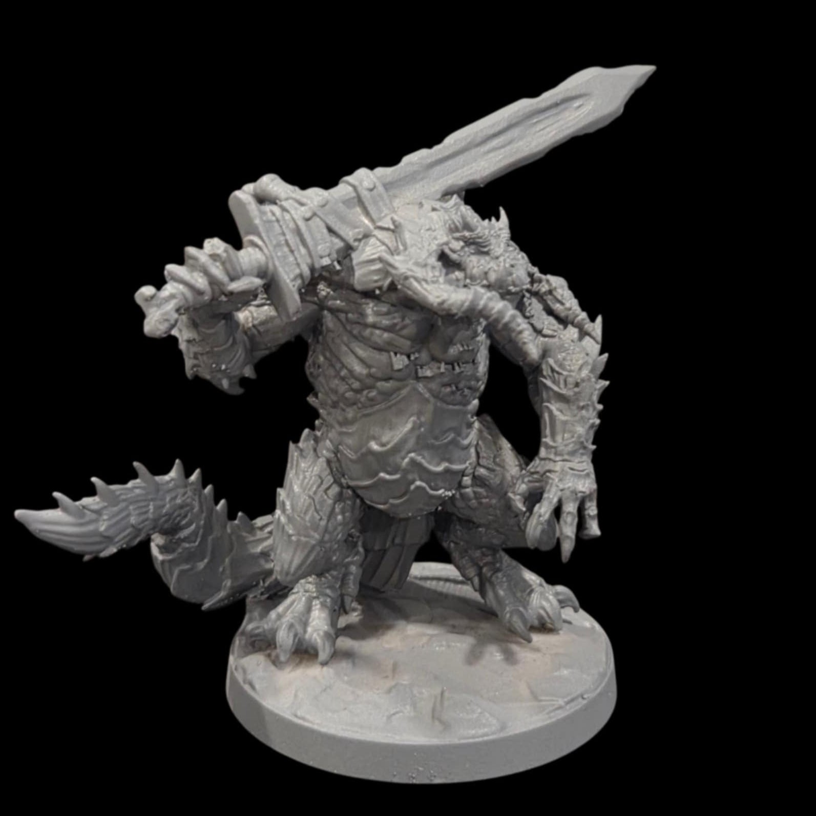 Dragon Ogre miniature for Dungeons & Dragons and Pathfinder, 69mm tall on 50mm base, reptilian creature with spiked armor plates, clawed hands, whipping tail, roaring head, fantasy TTRPG boss monster figure