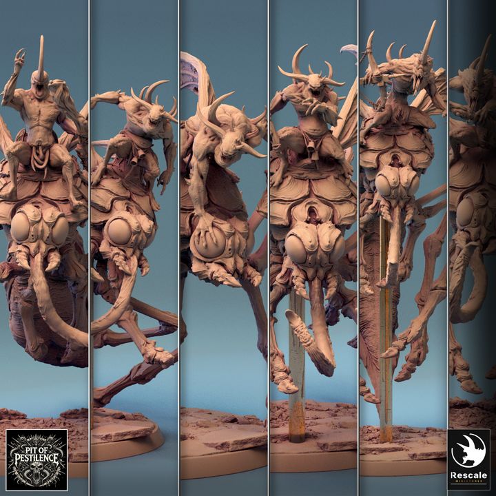 This Dravon collage showcases a variety of poses of the mounted insectoid creature with its armored rider, each highlighting intricate details of spindly legs, segmented bodies, and ominous wings. Perfect for dark TTRPG settings like Pathfinder and Dungeons & Dragons, these miniatures add horror and mystique to any collection.