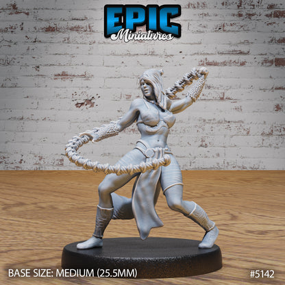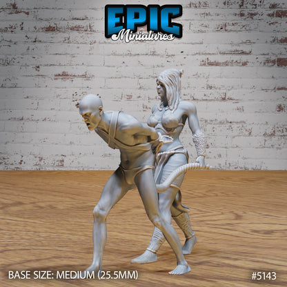 Female Slaver miniatures feature a fierce captor posed with a whip, a slave in chains, and standing variants ready for any dark fantasy scenario. Ideal for D&D, Pathfinder, and grimdark campaigns as sinister NPCs, villains, or evocative display pieces for painting collections.
