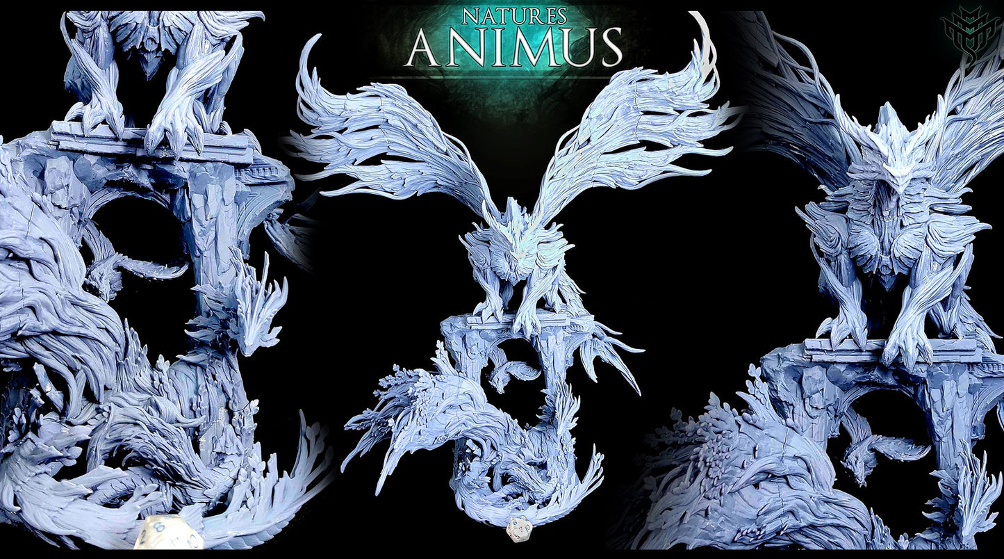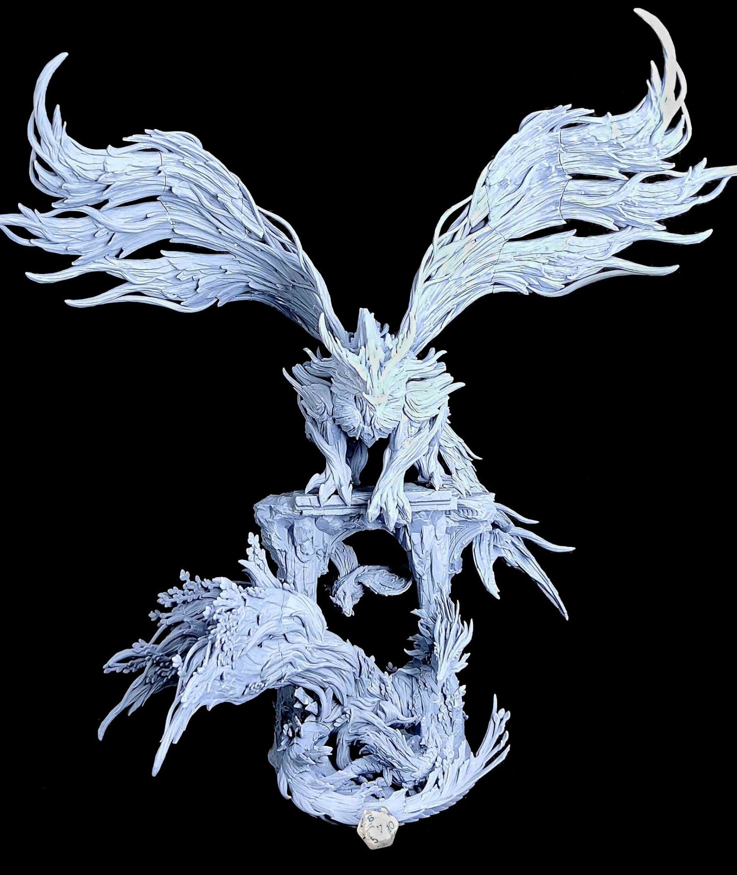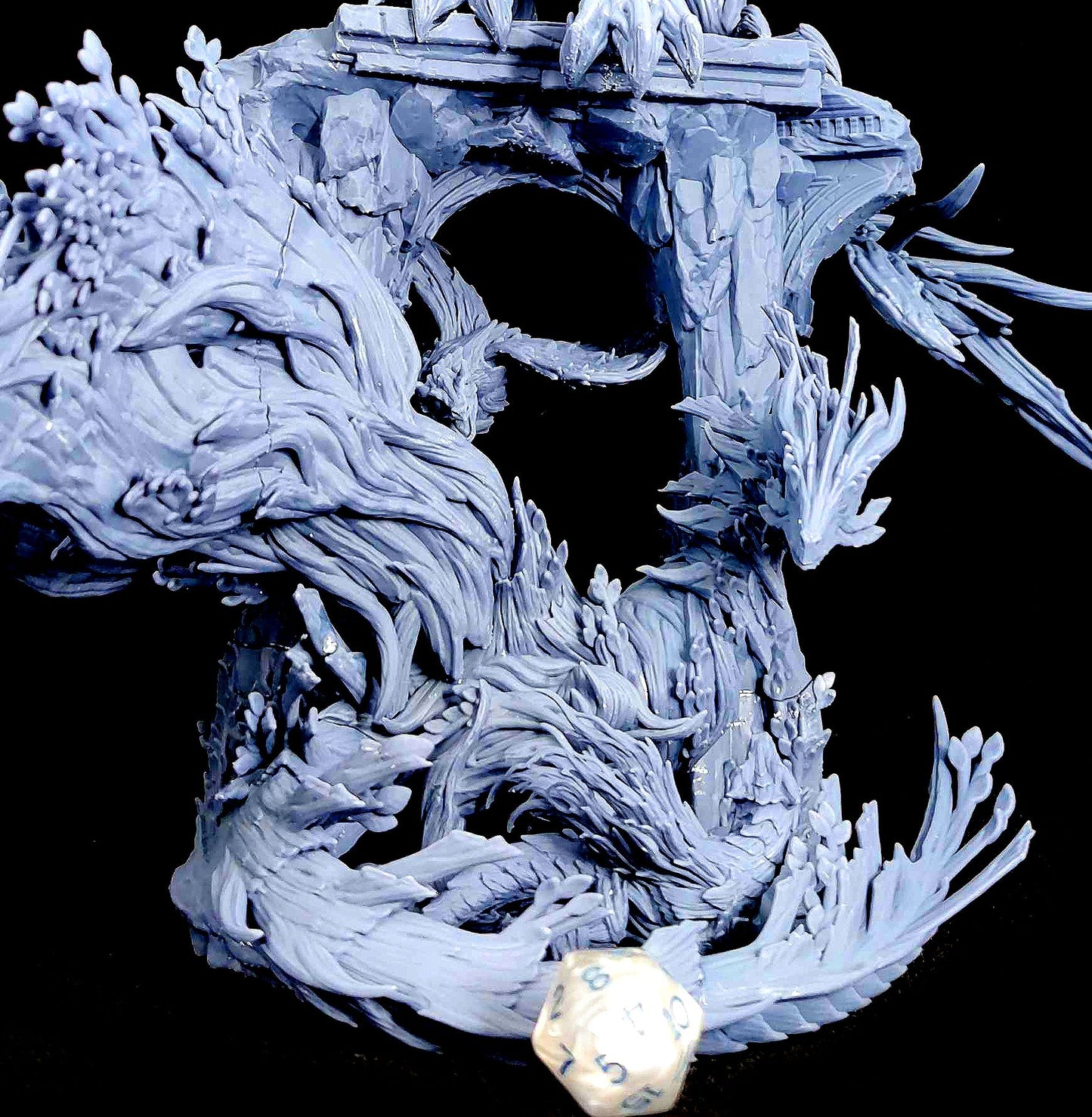 Discover the intricate Forest Dragon Family Diorama, featuring a majestic dragon perched atop a ruined stone archway, wings spread wide, with a smaller dragon winding below amidst foliage. Perfect for fans of fantasy TTRPGs like D&D, Pathfinder, and Warhammer, this piece brings a mythical scene to life.