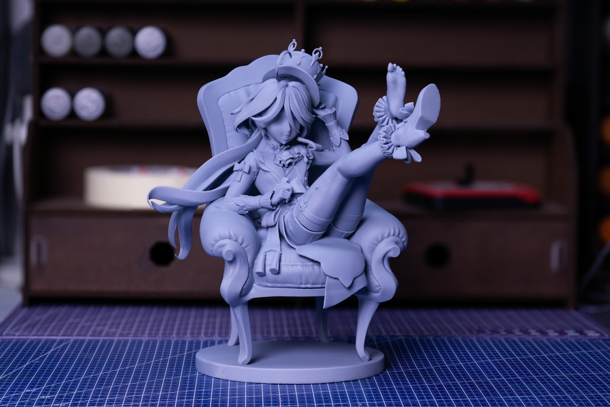 Furina de Fontaine lounges with theatrical confidence in this Genshin Impact collectible, seated atop an ornate chair with legs kicked high and crown tilted just enough to judge you. Elegant outfit details, playful posture, and commanding presence perfectly capture Fontaine’s dramatic Archon.