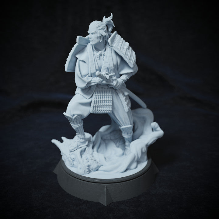 Hiraki Yoshida, a stoic samurai hero, poised for action with his hand on his katana, ready to defend his honor. Dressed in traditional armor, complete with a dragon-themed base, he exudes that “don’t mess with me” aura perfect for TTRPGs like Dungeons & Dragons or L5R. Seriously, you'd be better off picking another fight.