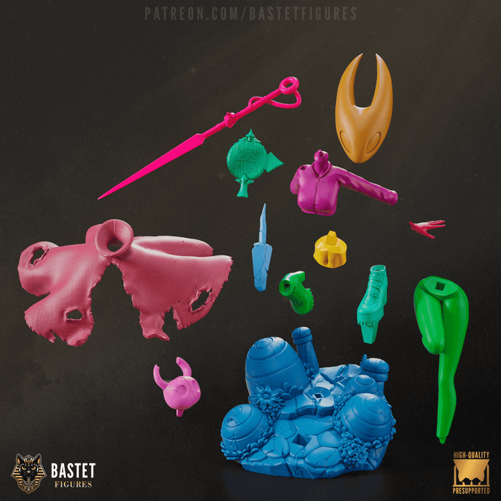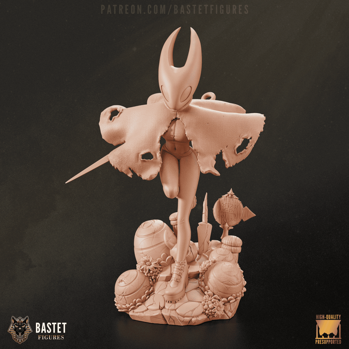 This Hornet figure collection by Bastet Figures includes a dynamic 1:8 scale collectible with base, a stylized bust with a shredded cape and needle, and a minimalist keychain. Perfect for fans of Hollow Knight and pop culture displays, accessories, or themed shelf decor.