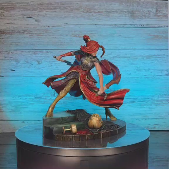 Katarina from League of Legends, captured mid-strike with dual blades and swirling cloak, stands on a battle-worn base featuring a fallen enemy. This 1:8 scale collectible includes dynamic pose variants and painting-friendly modular parts. Perfect for fans of stylized gaming figures.