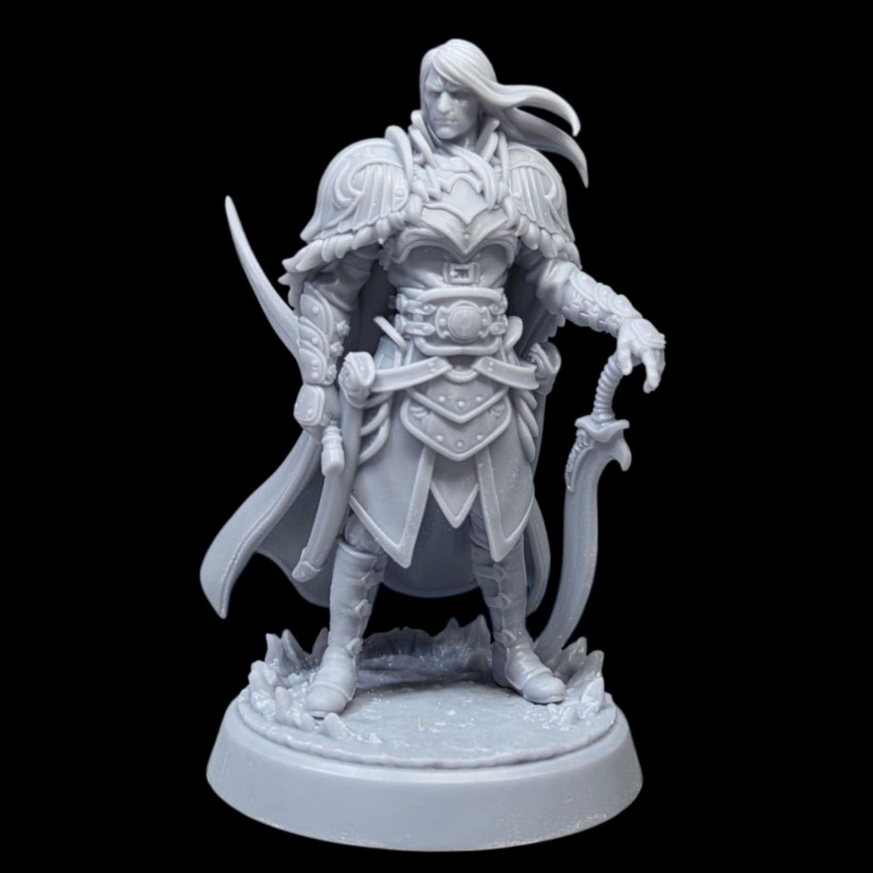 Levin, the Dark Elf Fighter, stands in a commanding pose, adorned in full plate armor with intricate details. Wielding dual swords, his cape flows behind him as he gazes forward with determination. A powerful figure for fantasy TTRPGs like Dungeons & Dragons and Pathfinder
