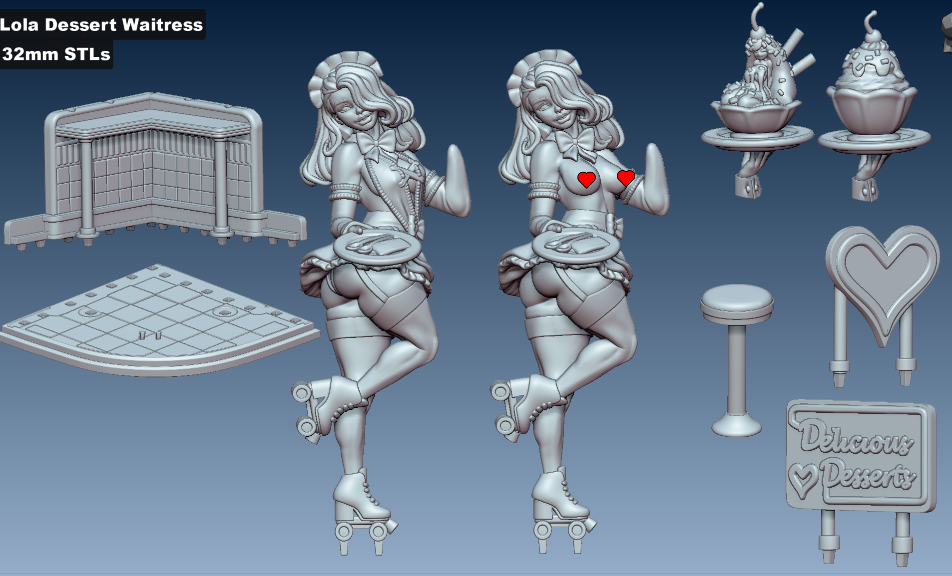 Lola, the flirty roller-skating dessert waitress, is served up in 32mm, 75mm, and 150mm scales, with both SFW and NSFW options. With interchangeable parts, soda fountain base, and a triple-sundae of sass, she’s the sweet tooth chaos your shelf never saw coming.