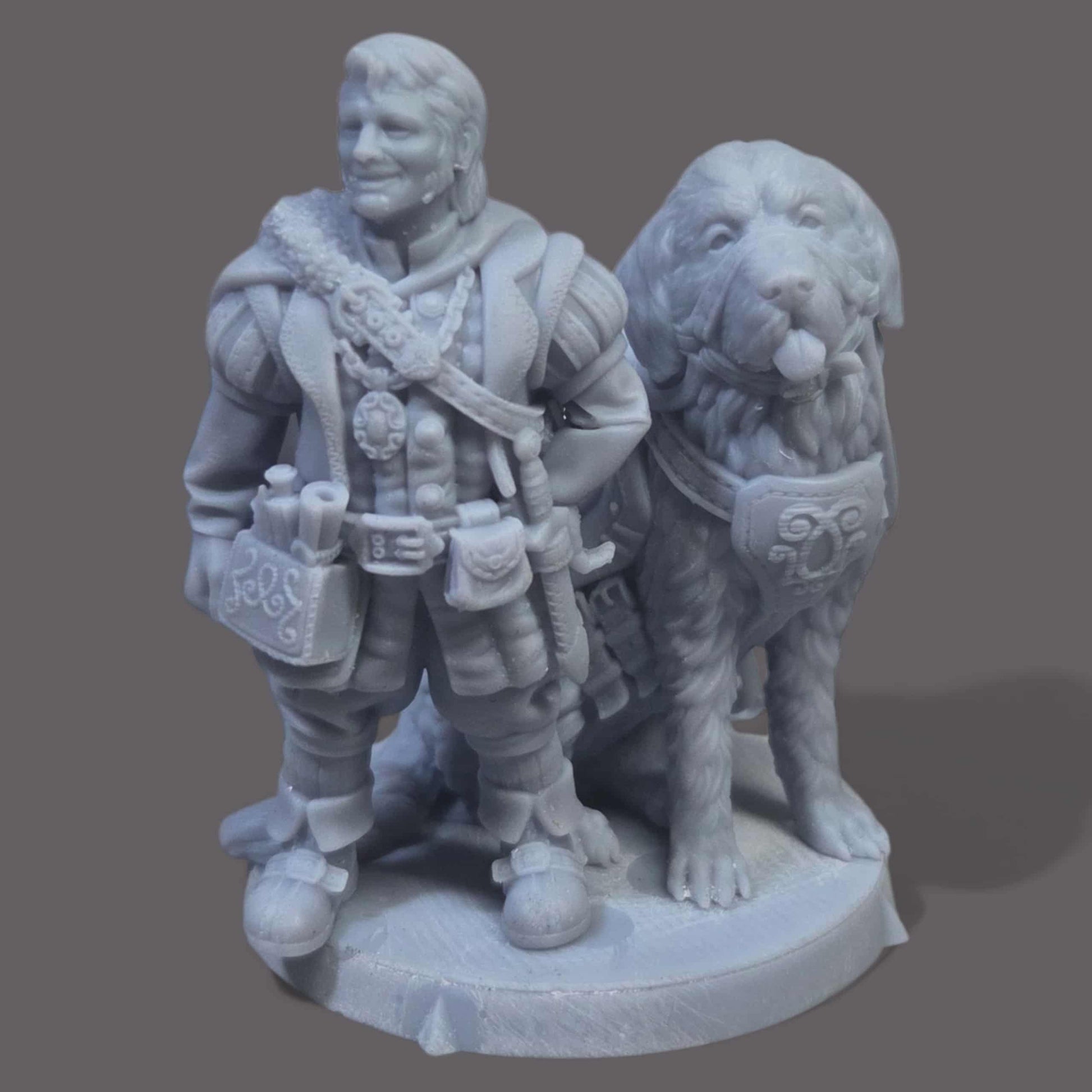 Longo Proudrock, a cheerful halfling adventurer, stands alongside his loyal companion, a dog named Moga. Perfect for lighthearted and whimsical TTRPG campaigns like Pathfinder or Dungeons & Dragons, these two are ready to embark on quests, solve mysteries, or just find the best sticks.