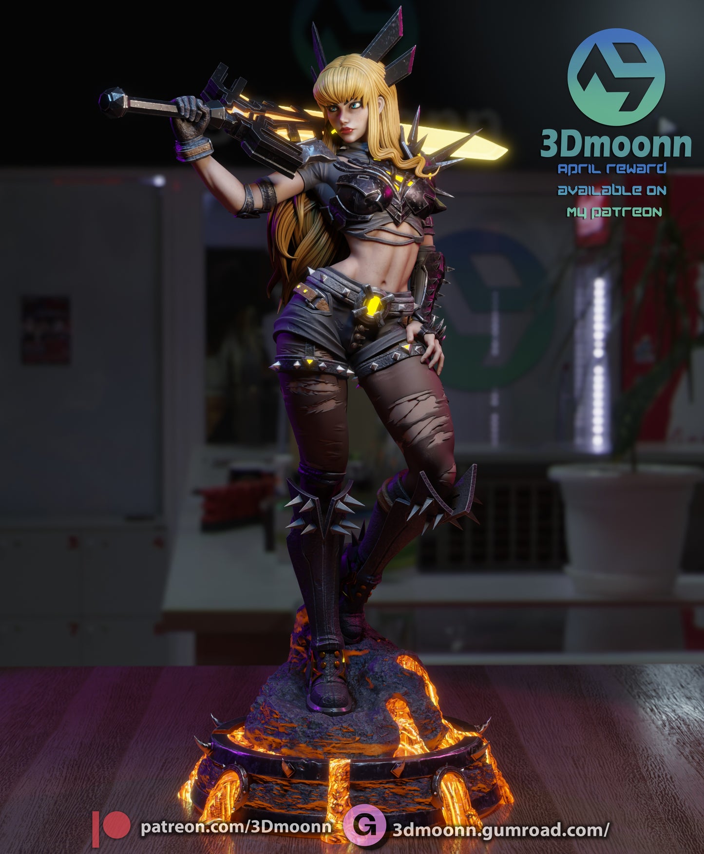 Magik-inspired 1:6 scale collectible stands atop a molten base, wielding a glowing arcane blade and adorned in spiked armor. Includes SFW and NSFW display options. Perfect for superhero collectors and fans of Marvel-style characters in display-scale dioramas.