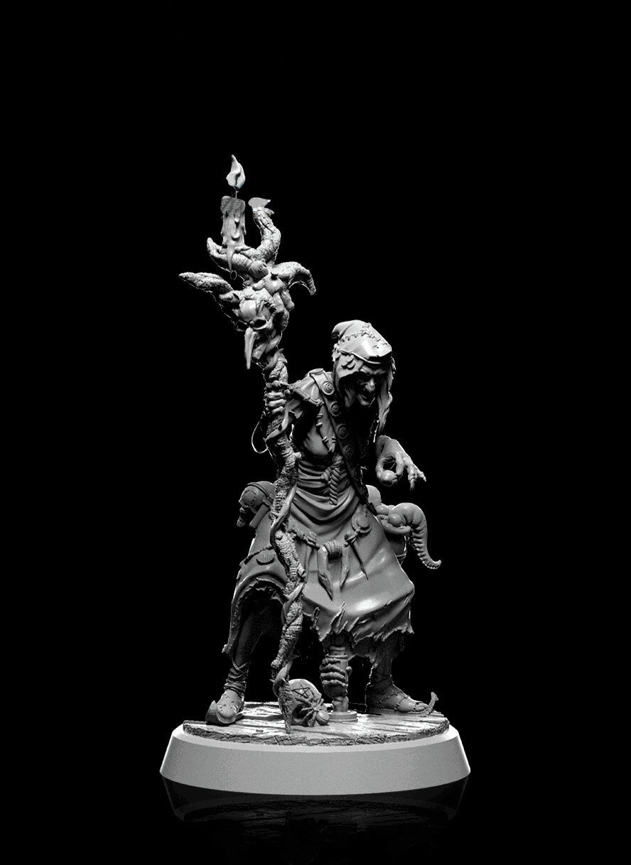 Morvina Mirewood, the Black Hag, stands poised with her twisted staff and eerie adornments. This sinister figure embodies the essence of dark magic and is perfect for dark fantasy TTRPGs like Warhammer or Dungeons & Dragons, ready to add a chilling atmosphere to any campaign.