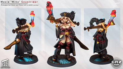Moxie 'Minx' Seastrider, a mischievous female goblin pirate, stands ready for adventure. This figurine features her iconic pirate attire, with a vibrant parrot perched on her shoulder and a flintlock rifle at her side. Ideal for fantasy tabletop games like Pathfinder and D&D, she's perfect for swashbuckling scenarios.
