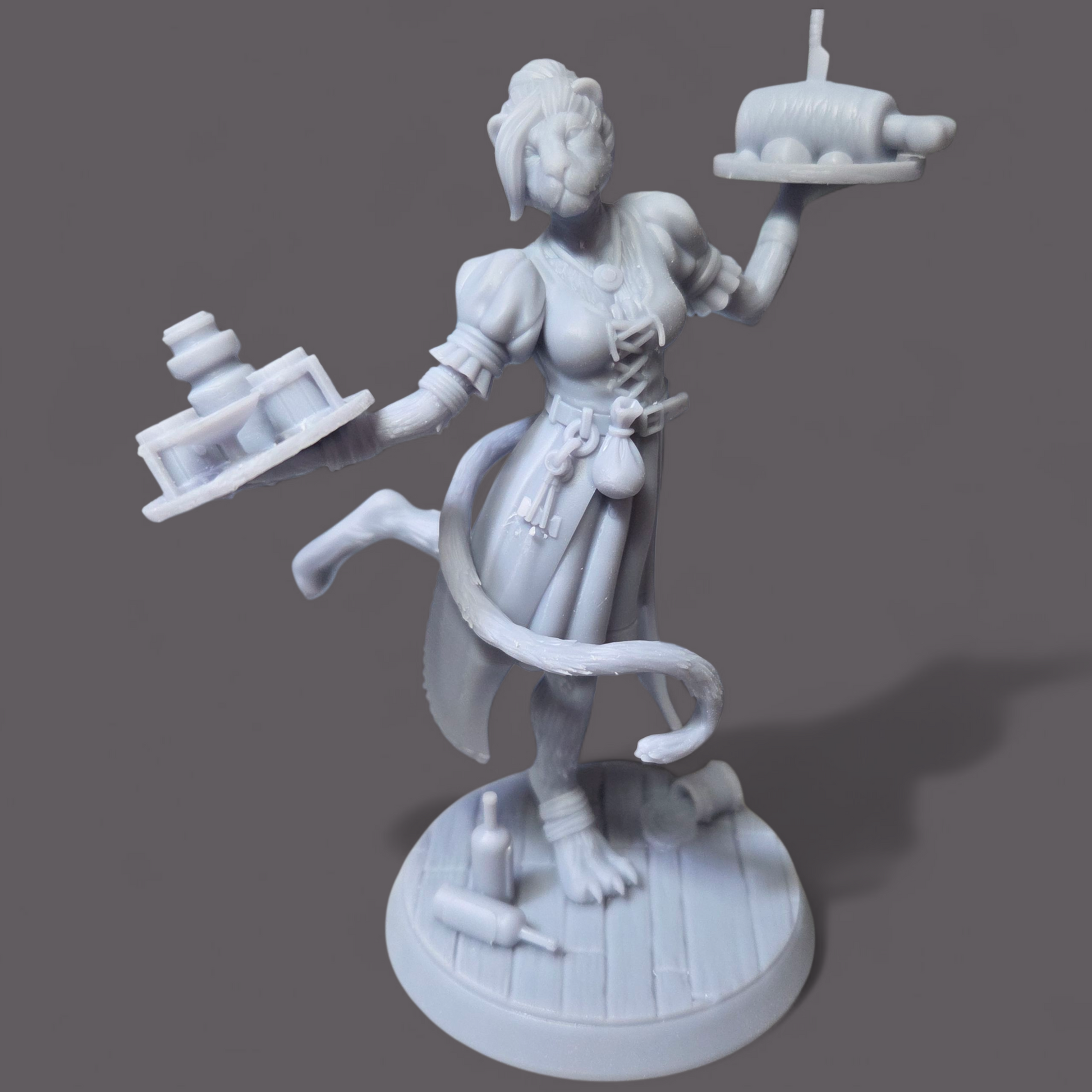 Introduce Ms. Tabitha, the feline waitress, to your tabletop RPG adventures. This highly detailed miniature features a catfolk server balancing trays of food and drink, adding charm and character to Dungeons & Dragons, Pathfinder, and other fantasy settings.