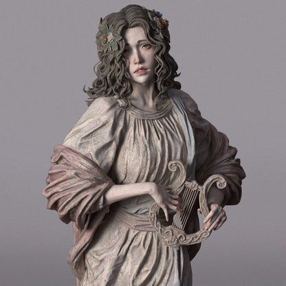 This 1:6 scale Muse of Music figurine stands in flowing classical robes with a lyre in hand and floral crown in her hair. Inspired by Greek mythology and ideal for collectors of Hellenic art, this statue evokes the grace of Terpsichore or Euterpe. Great for display or painting.
