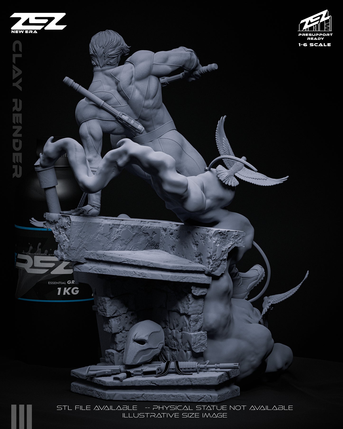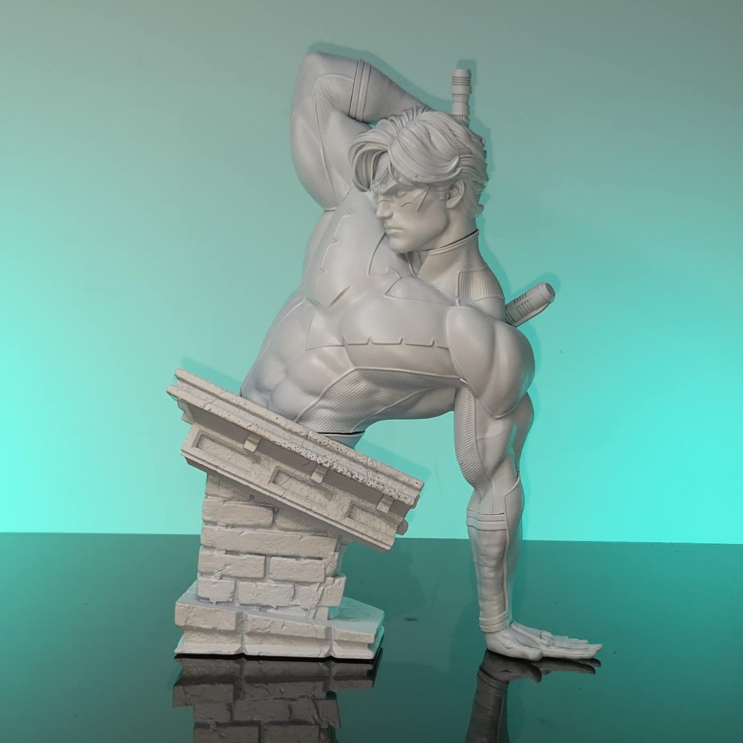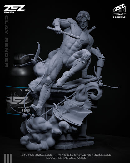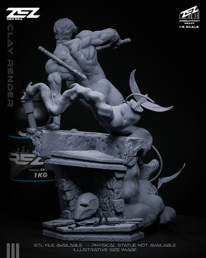 Nightwing leaps into action with acrobatic flair in this 1:6 scale DC Comics collectible statue and bust. Featuring his signature escrima sticks, stealth armor, and rooftop base adorned with the Bat emblem, this dynamic piece captures Gotham’s favorite vigilante in mid-motion.
