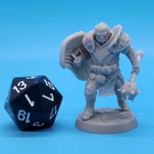 Oloven, a powerful Firbolg Paladin miniature for tabletop RPGs like Pathfinder or Dungeons & Dragons. This detailed model depicts a heavily armored warrior with a large sun-themed shield and a massive mace, perfect for any fantasy setting.