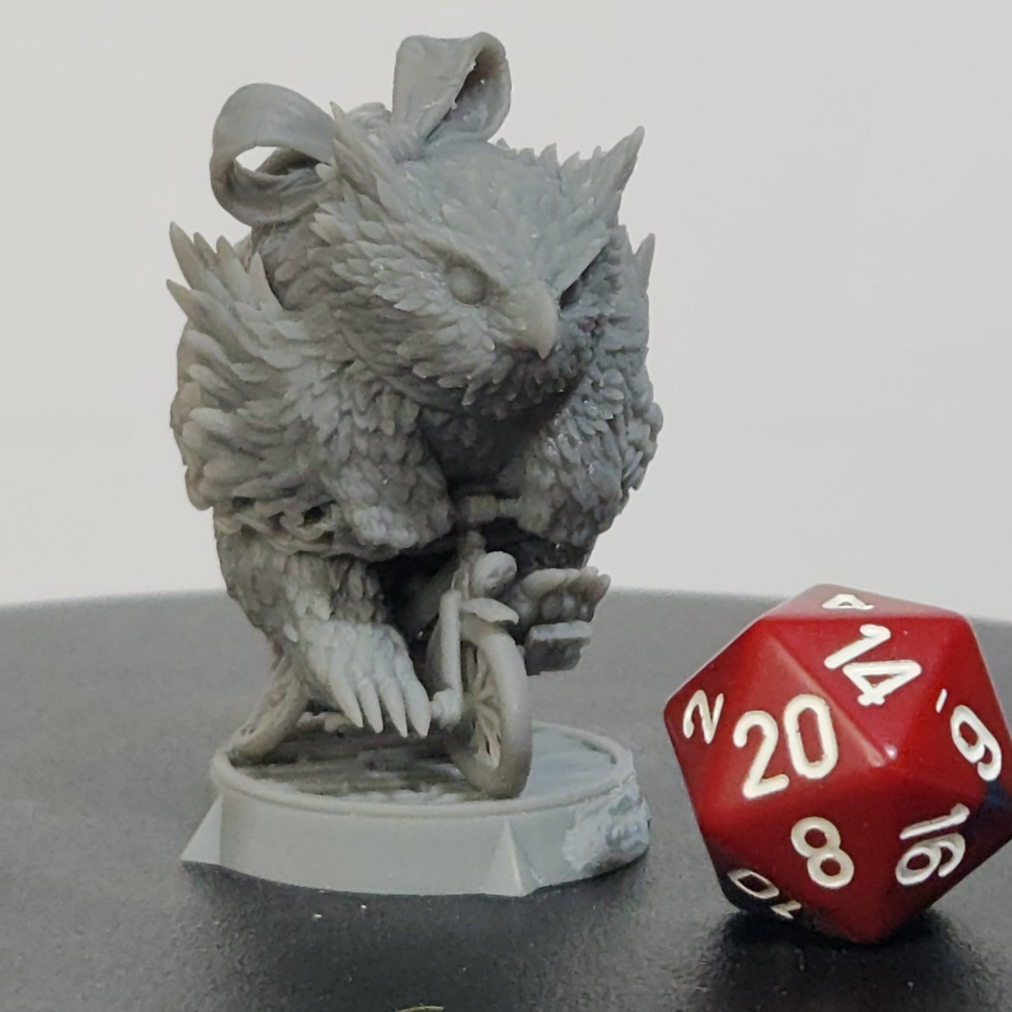Owlbear miniature for TTRPGs like Dungeons & Dragons and Pathfinder. A whimsical depiction of an owlbear riding a unicycle in a circus setting, ideal for painting enthusiasts and adding unique charm to any fantasy tabletop campaign.