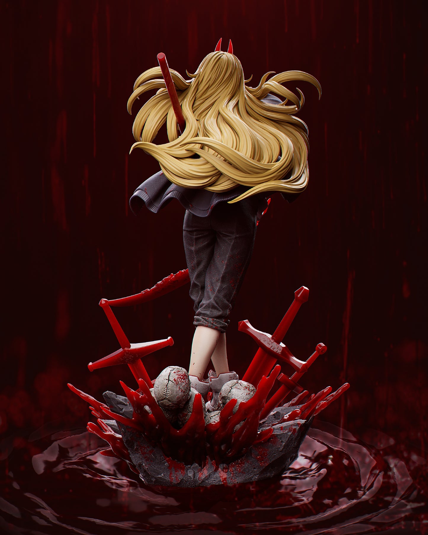 Power from Chainsaw Man stands mid-leap with her blood weapon raised, surrounded by embedded swords and blood erupting from a cracked base. Her devil horns, sharp gaze, and splattered uniform capture her chaotic energy. A dynamic collectible for anime fans and manga lovers.