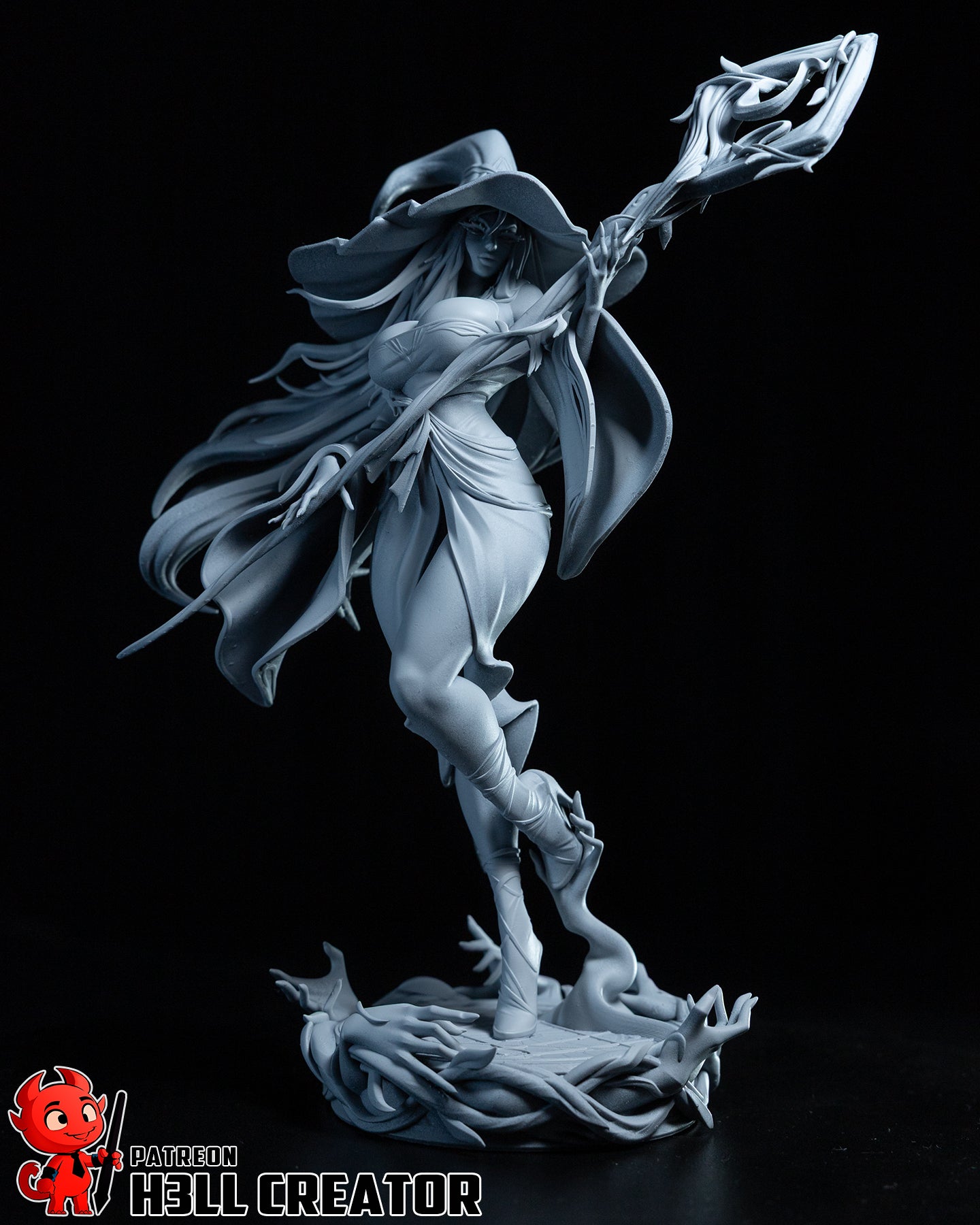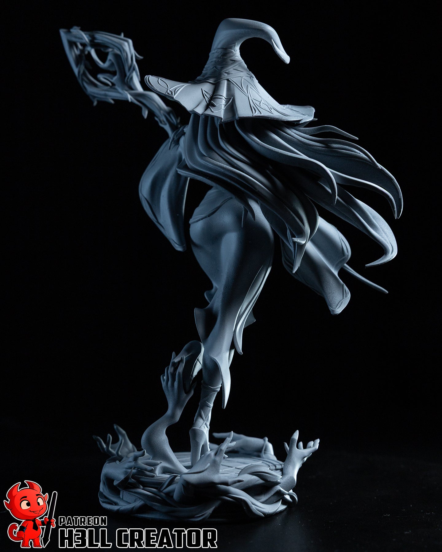 Recluse, a sorceress inspired by Elden Ring, stands in a dynamic casting pose with her staff raised high and robes swirling around her. This 1:8 scale collectible figure features modular parts, a detailed rocky base with grasping hands, and a captivating witch hat.