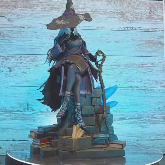 Recluse, an Elden Ring inspired witch figurine in 1:7 scale, depicts a dark-skinned sorceress seated on a stone base surrounded by tomes and a gnarled staff. She wears a flowing robe and a wide-brimmed hat, holding a spellbook and conjuring magic. Perfect for collectors and painters.