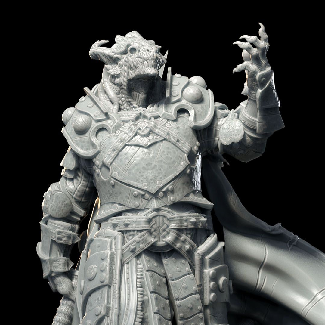 Rhogar Caellestine, a dragonborn paladin clad in heavy ornate armor, stands poised with his warhammer and cape billowing in the wind. This highly detailed miniature is perfect for TTRPG campaigns like D&D and Pathfinder, bringing a powerful and noble character to life.