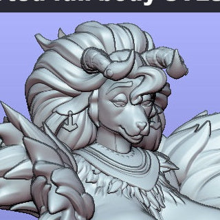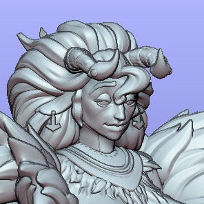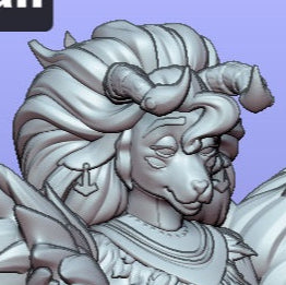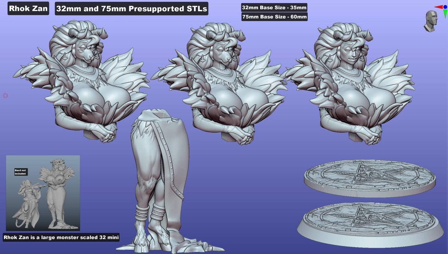 Rhok Zan is a female Lovecraftian pin-up creature with demonic and faun-like features, posed standing on a detailed summoning circle base. With her floral cloak, fur-covered legs, horns, and monstrous elegance, she fits well into horror-fantasy TTRPGs like Mörk Borg or Call of Cthulhu.