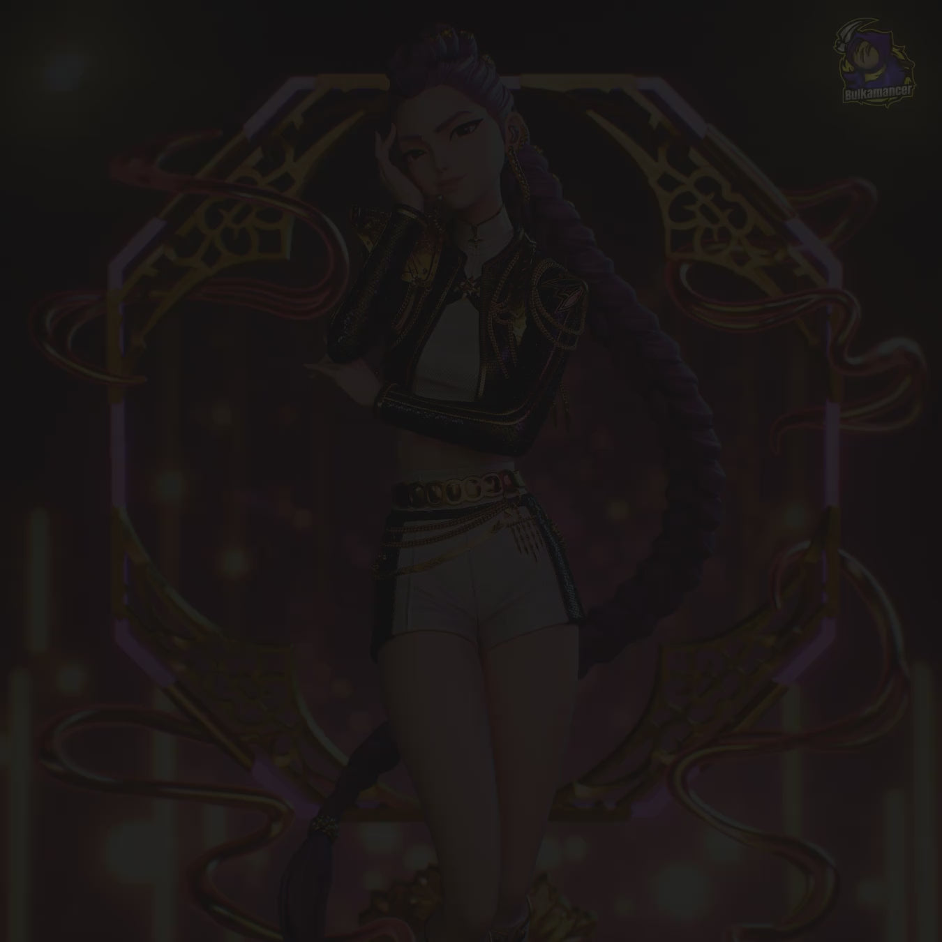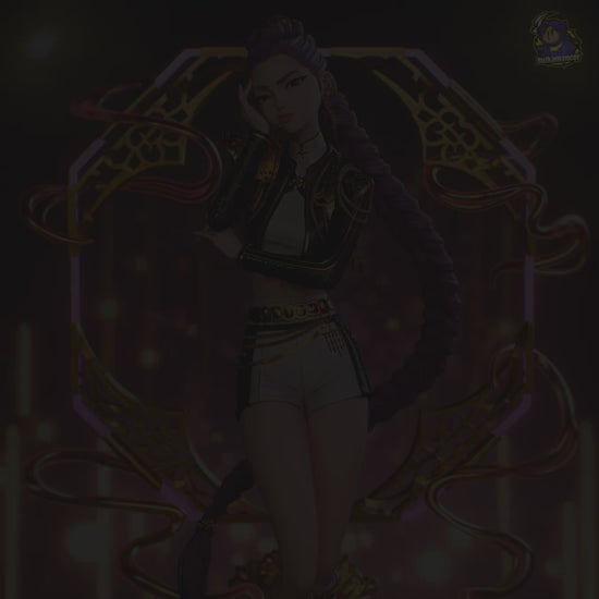 Rumi from K-Pop Demon Hunters strikes a confident pose with her long braided hair, cropped jacket, and stage shorts. Standing on an ornate base with floral accents and swirling energy effects, this 1:8 scale figure blends idol glam with supernatural flair. Perfect for fans chasing plastic regret with style.