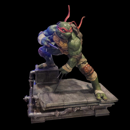 A collection of dynamic Teenage Mutant Ninja Turtles-inspired figurines or full diorama. Each turtle displays distinct stances and weaponry, embodying unique personalities, from stealthy crouching poses to action-ready combat stances, perfect for media room or man-cave/lady-cave decor or center piece for lovers of the comics, cartoon, and films.