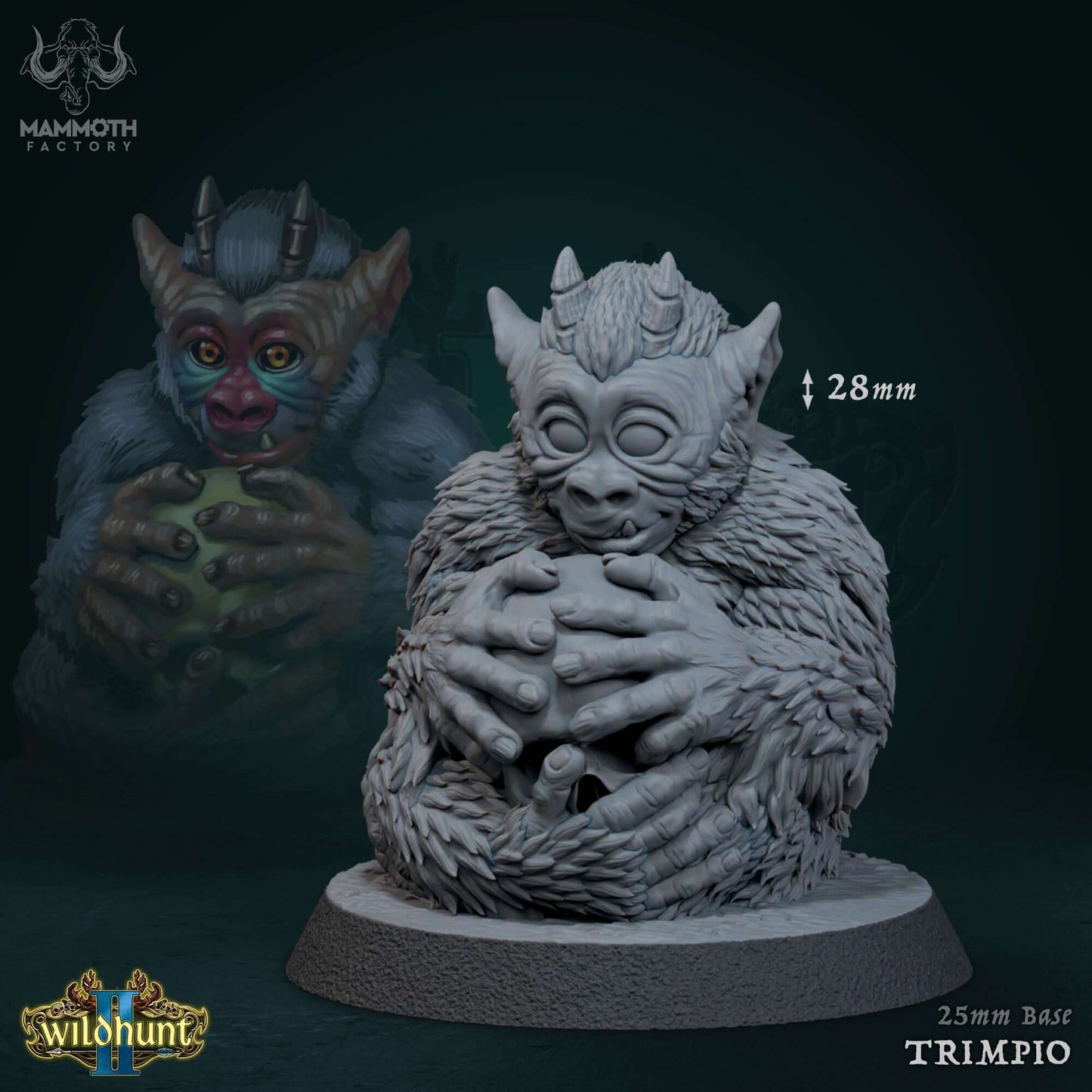 Trimpio is a horned monkey seated, with its arms and legs wrapped around a skull. This unique creature combines a mystical air with its unusual posture, making it a captivating addition to any fantasy RPG setting.