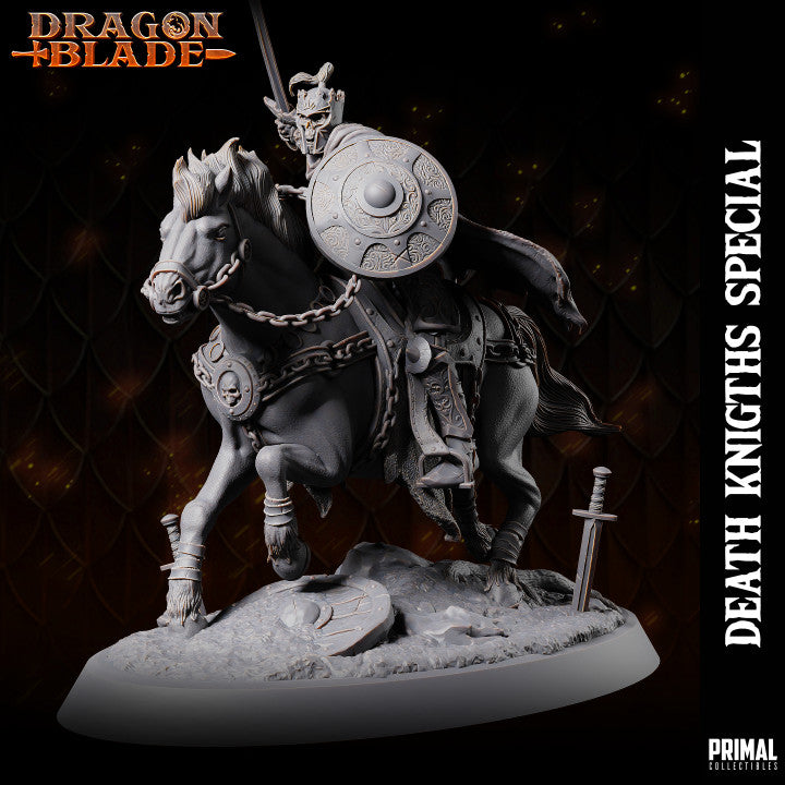 Explore the ominous Trogmor's Charge, featuring the undead Lord Trogmor wielding a torch atop a skeletal steed. Accompanied by two Death Knights, each with swords and shields, these armored warriors ride through a desolate, skull-laden battlefield in a dark fantasy setting perfect for tabletop RPGs like D&D and Pathfinder.
