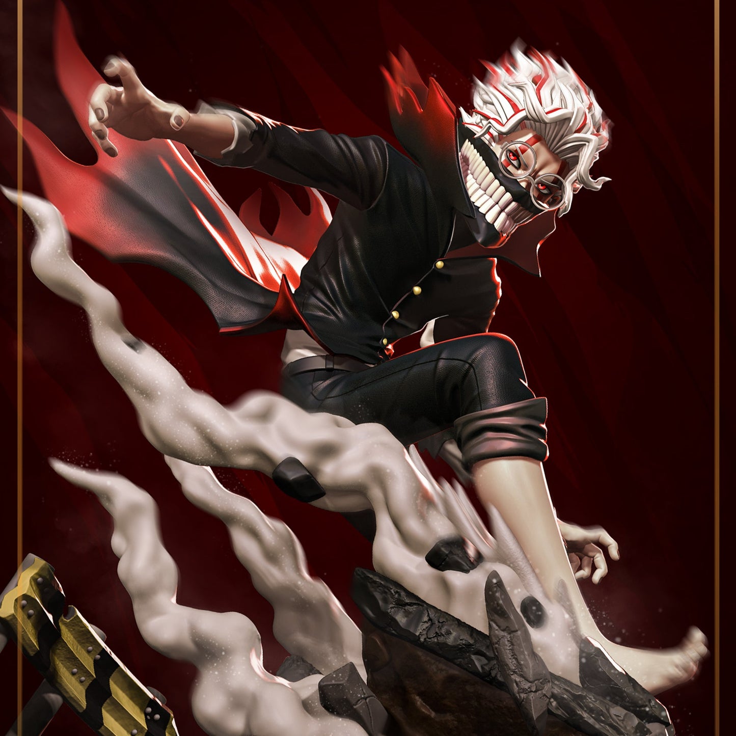 Turbo Okarun from Dandadan is sculpted in a dynamic leaping pose over swirling smoke and a shattered concrete base. This 1:10 scale figure includes a full-size, bust, and miniature format, ideal for collectors and painters seeking stylized motion and expressive design.