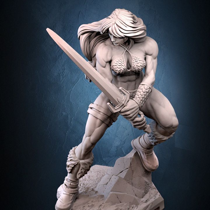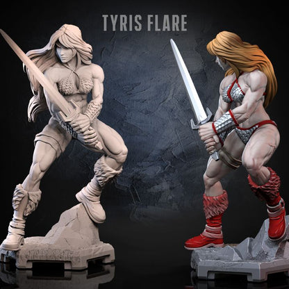 Tyris Flare miniature features a fierce barbarian warrior inspired by Golden Axe, wielding a large sword in a dynamic battle stance. Includes modular parts for custom assembly and painting. Perfect for D&D, Pathfinder, or any fantasy RPG where a legendary heroine belongs.