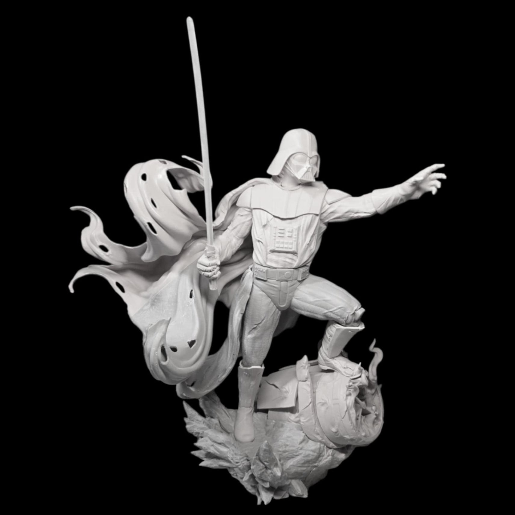 Vader - SW collectible includes both a full-body and bust rendition of the iconic Sith Lord. The full figure features Darth Vader with a torn cape, battle-damaged armor, and a red lightsaber standing atop flaming wreckage. The bust showcases helmeted and unmasked variants.